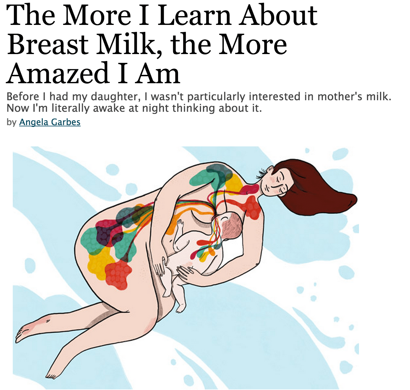 “According to Hinde, when a baby suckles at its mother’s breast, a vacuum is created. Within that vacuum, the infant’s saliva is sucked back into the mother’s nipple, where receptors in her mammary gland read its signals. This “baby spit backwash,” as she delightfully describes it, contains information about the baby’s immune status. If the mammary gland receptors detect the presence of pathogens, they compel the mother’s body to produce antibodies to fight it, and those antibodies travel through breast milk back into the baby’s body, where they target the infection.”